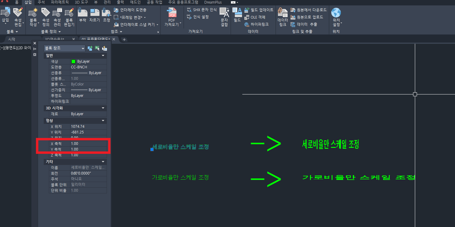 특성창의 카테고리 형상에서 X축적 or Y축적을 변경하여 객체의 크기 변경이 가능합니다.