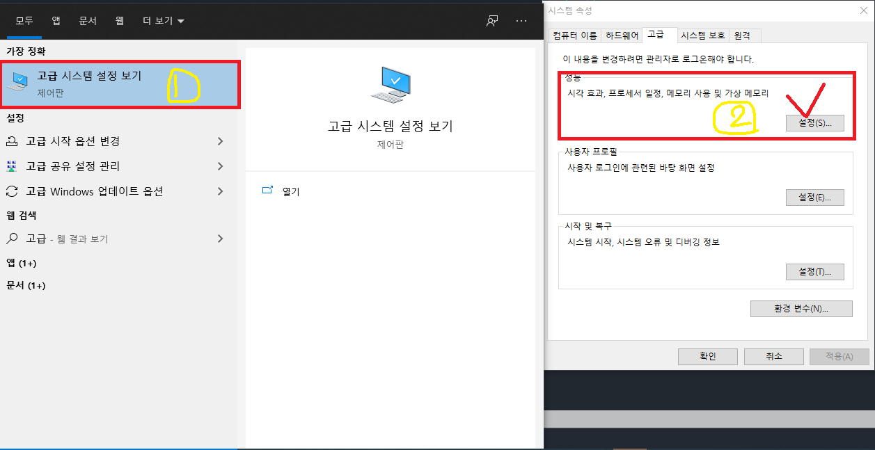 1. 윈도우 검색창에 '고급 시스템 설정 보기'를 검색합니다.