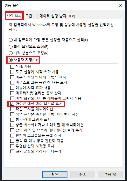 위 사진과 같이 시스템 속성 -> 고급 -> 성능 설정을 열어 아래 사진과 같이 옵션을 설정해 줍니다.
