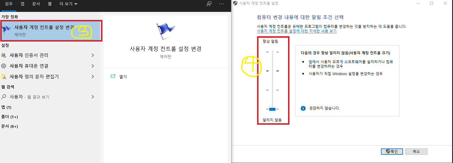 2. 검색창에 '사용자 계정 컨트롤 설정'을 검색합니다.